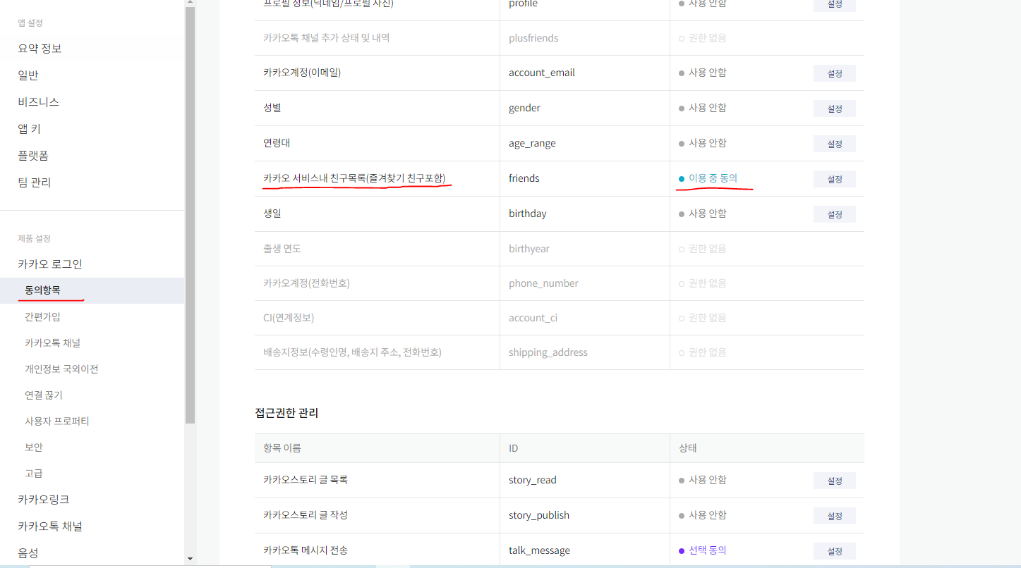 2. [초대된 팀원에 해당] 개발중인 APP에 들어가서 동의항목 > 카카오 서비스내 친구목록을 이용 중 동의로 변경.