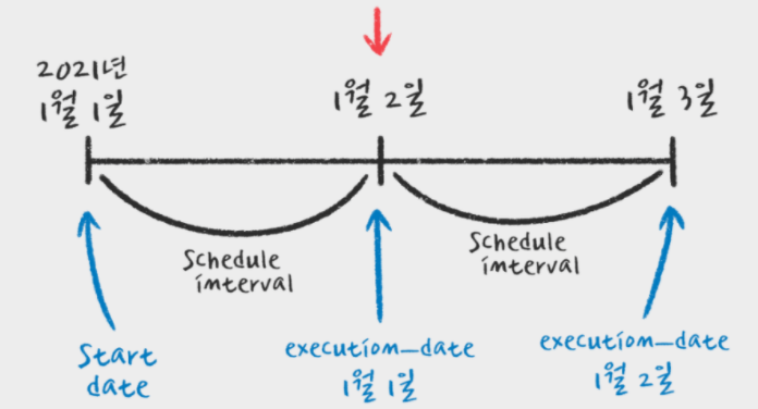 이유는 아래 사진처럼, 1월 2일 (1월 1일 00:00~23:59까지의 데이터를 다 갖춘 후)에 1월1일의 데이터 전부를 대상으로 작업이 진행 될 수 있기 때문이다. (Schedule_interval이 daily로 설정되어있기 때문에 1일 후 동작한다)