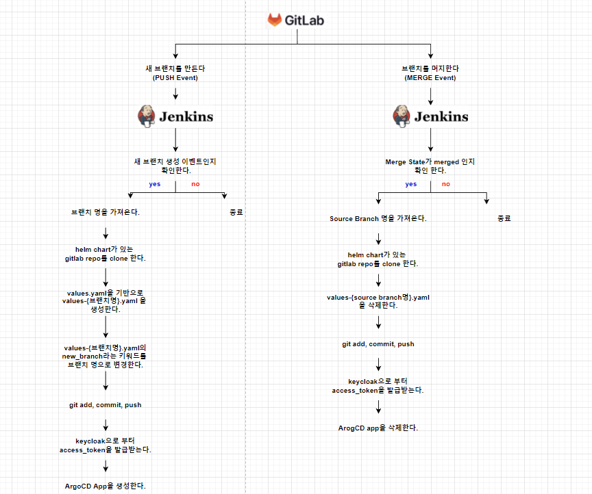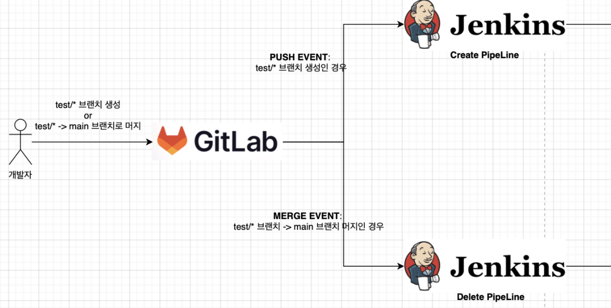 jenkinsfile에서는 새로운 브랜치 생성 push Event가 발생할 때마다 상세 동작방식은 아래와 같다.