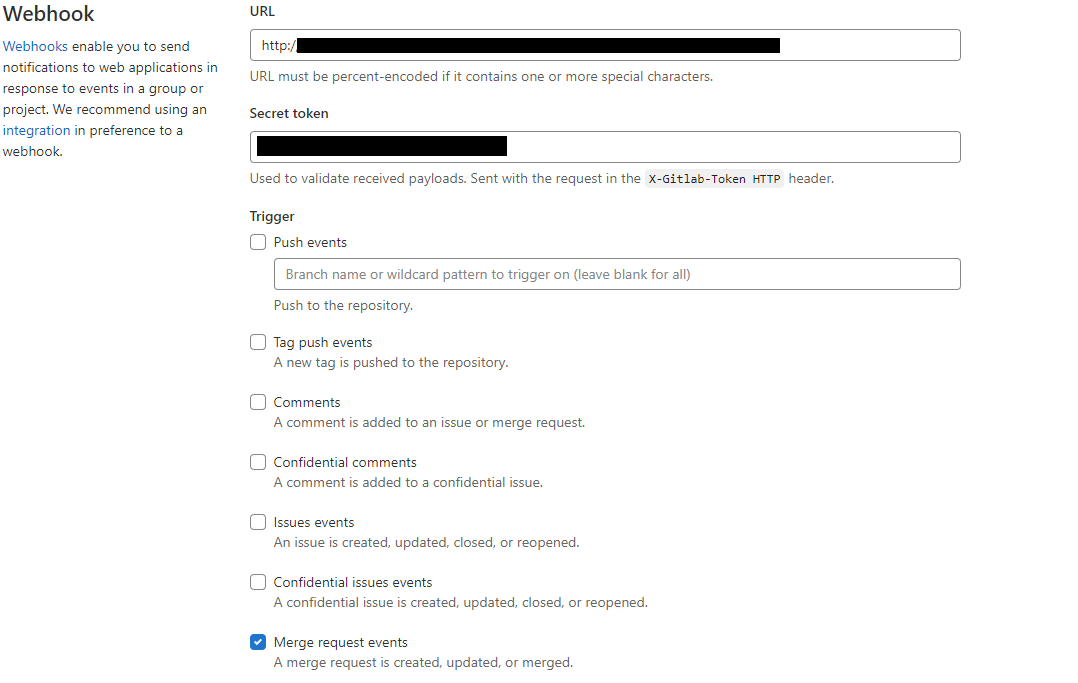 - Delete 관련 PipeLine에 사용할 Gitlab webhook 설정 (Merge Event)